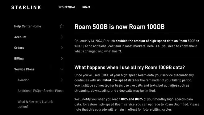 相比之下,升级前的50GB套餐则规定,超额数据需按每GB 1美元的价格付费,否则SpaceX将在当月剩余时间内暂停用户的网络访问权限。