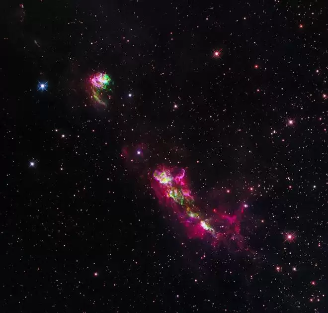 从公布的图像中可以看到,一道明亮的粉色与绿色光斑斜向划过漆黑的宇宙背景。这对被称为HH 80/81的赫比格-哈罗天体,犹如宇宙中绽放的“烟花”,生动展示了恒星诞生瞬间所释放的剧烈能量。其中,左上角的光斑属于HH 81,底部条状纹路则源自HH 80。
