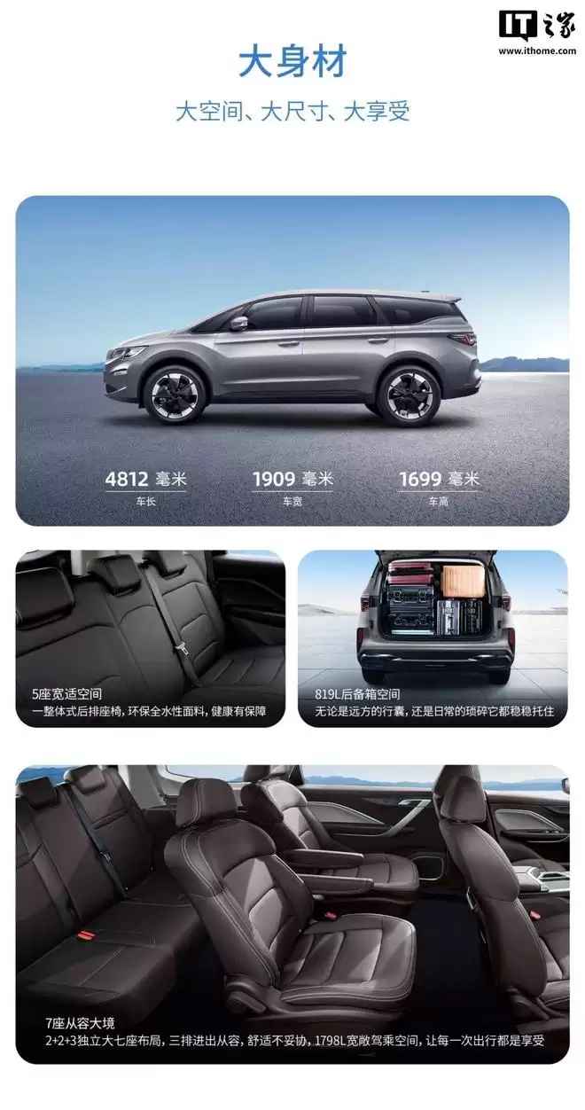 其中,标准续航版(5座)的官方指导价为12.78万元,上市限时价为11.28万元;长续航版(5座)官方指导价13.58万元,限时售价12.08万元;长续航版(7座)官方指导价13.78万元,限时售价为12.28万元。