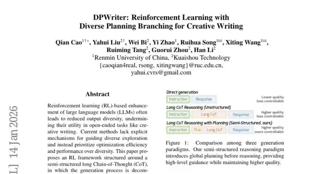 创意写作一直是人类独有的艺术天赋,但随着人工智能的快速发展,机器是否也能拥有创造力成为了一个引人深思的话题。最近,中国人民大学联合快手科技的研究团队发表了一项突破性研究,他们开发出了一个名为DPWriter的AI写作系统,这项研究于2025年1月发表在arXiv预印本平台上,编号为arXiv:2601.09609v1。有兴趣深入了解的读者可以通过该编号查询完整论文。