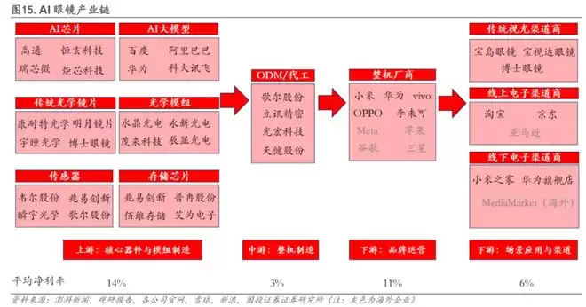 国投证券研报显示,AI眼镜产业链可分为上游核心器件与模组制造、中游整机制造和下游品牌及渠道,同时呈现“上游卡技术、中游拼规模、下游重品牌”的特征。AI眼镜产业链价值分配整体和消费电子相似,呈现微笑曲线特征,附加值更多体现在两端,而中游的制造环节利润相对较低。