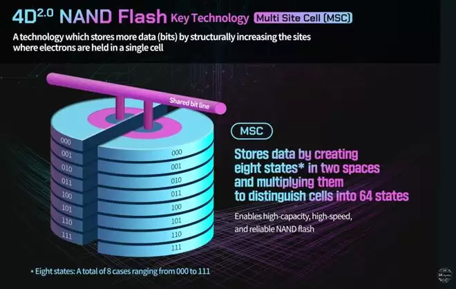 报告显示,SK海力士的5-Bit NAND采用了名为Multi-Site Cell(MSC)的NAND方案。该方案能够将每个3D NAND存储单元一分为二,在提升单元数据容量的同时,将所需的工作电压降低约三分之二。