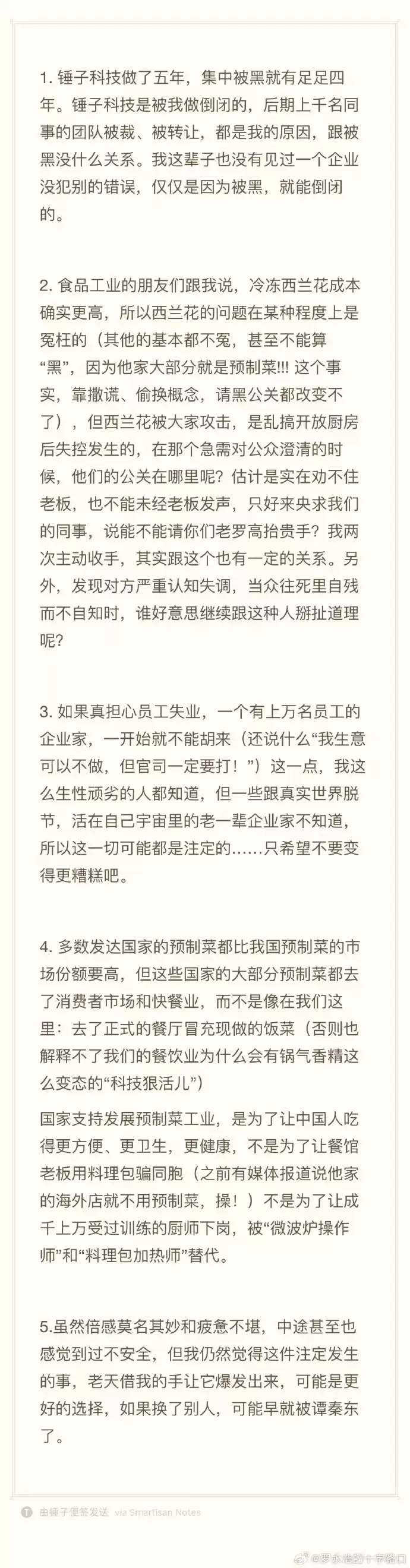 1月16日下午,罗永浩再次发布长文回应贾国龙,称“我这辈子也没见过一家企业没犯过别的错误,仅仅是因为被黑,就能倒闭的。”
