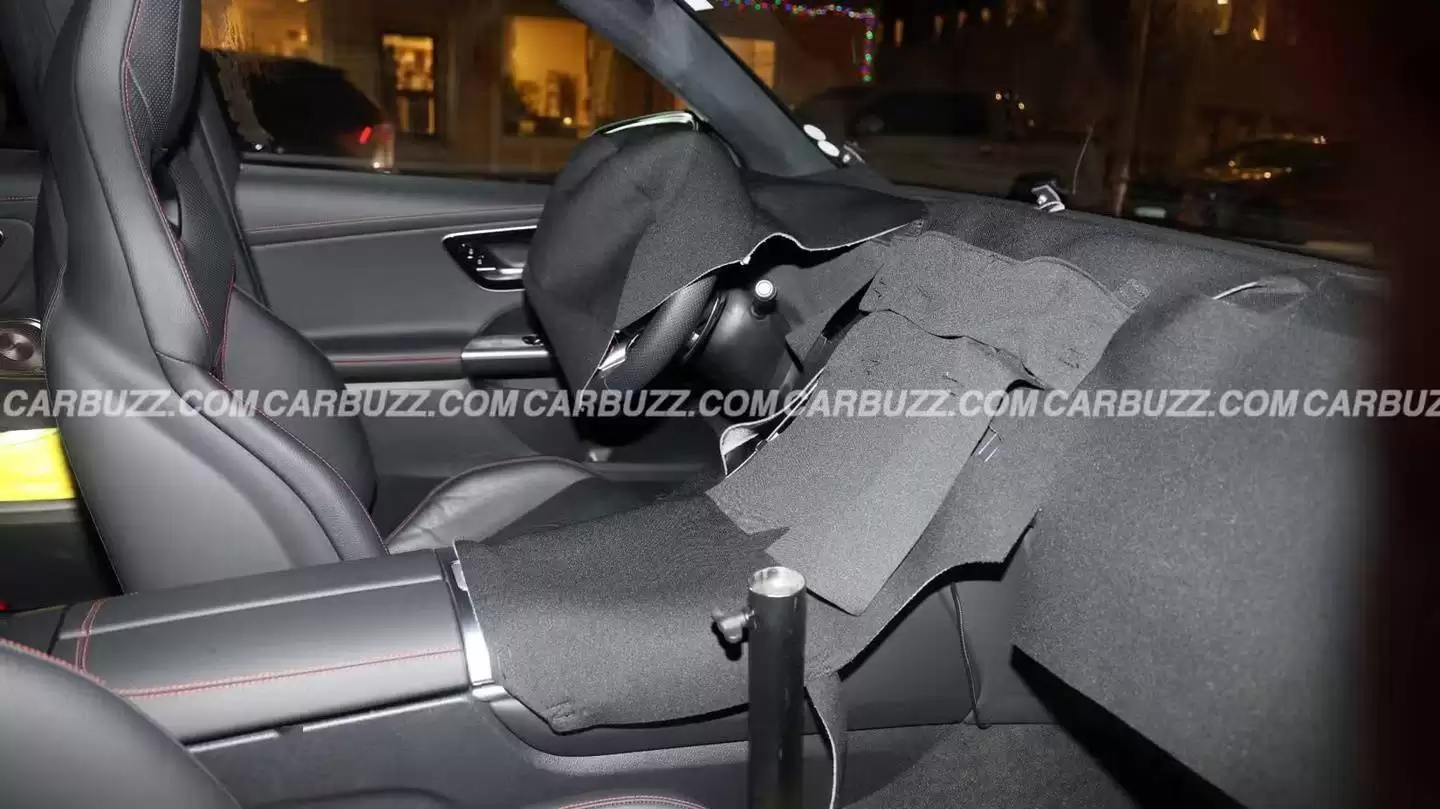 从内饰细节来看,虽然测试车的仪表盘、中控台和方向盘区域仍被织物覆盖,但通过露出部分可以推测,新车将基本保持现款车型的整体布局。不过,梅赛德斯-AMG显然在数字化体验方面进行了重点升级,预计将配备最新一代的MBUX信息娱乐系统,并优化人机交互界面设计。