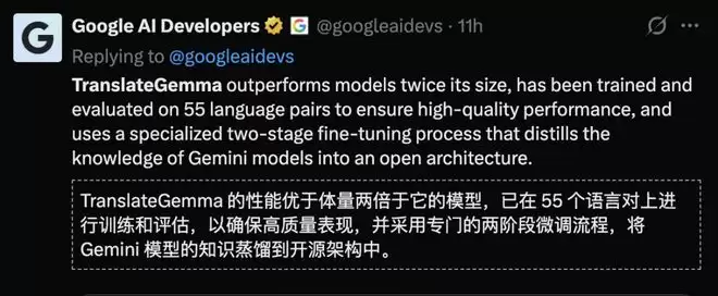 不同于OpenAI几乎悄无声息的上线ChatGPT翻译,谷歌全网高调宣布发布了支持55种语言的开源翻译模型TranslateGemma。