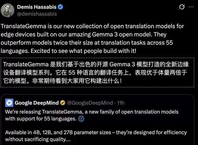 TranslateGemma,一个能在手机上翻55种语言的开源模型。