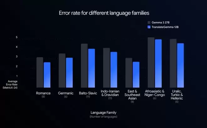 12B参数规模的TranslateGemma模型,在WMT24++基准测试中使用 MetricX 衡量后,性能超越了27B的Gemma 3基线模型。