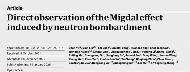 图 | 团队论文“通过中子轰击诱发的米格达尔效应的直接观测”(来源:Nature)