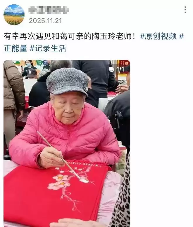 她穿着粉色羽绒服、戴着奶奶帽,一起啊参加老年人的公益活动。用毛笔在围巾上作画,图样很有风骨。