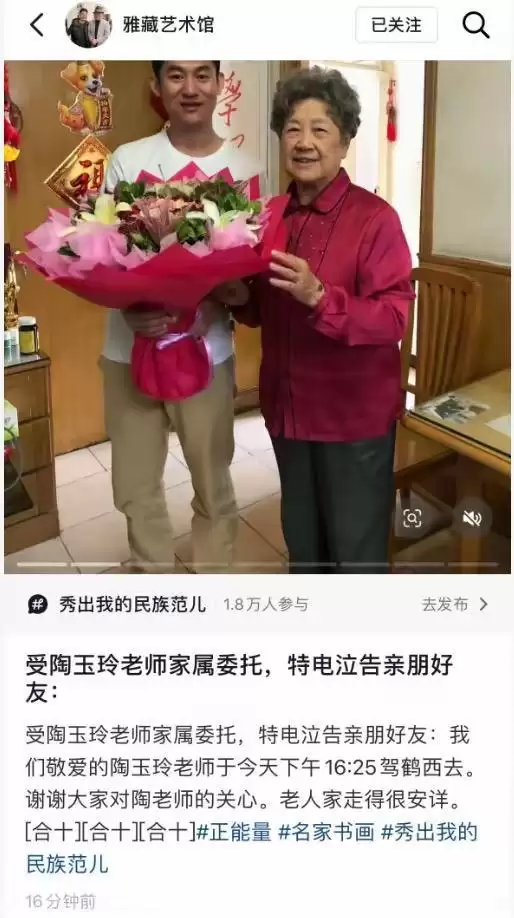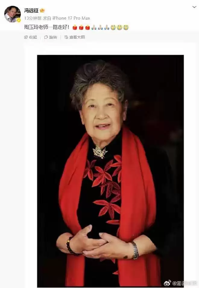 冯远征选了陶老师很有精气神的照片,穿着黑底红花的旗袍、披着大红色围巾,精神抖擞、仿若音容笑貌还在眼前。