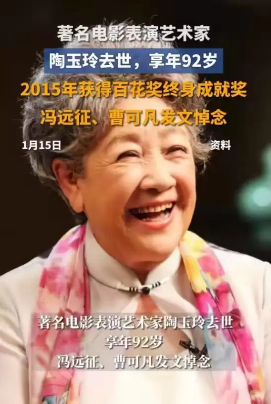 1月15日,著名电影表演艺术家陶玉玲去世,享年92岁。