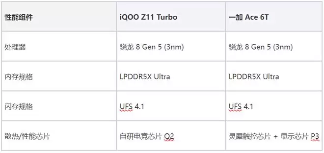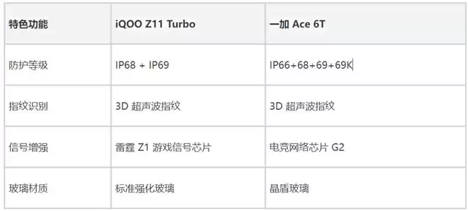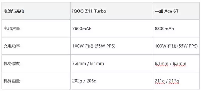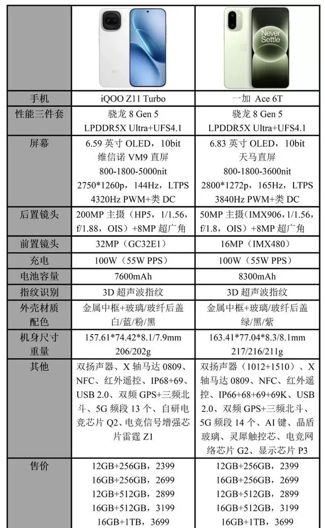 选择iQOO Z11 Turbo的理由:你是重度手游玩家,需要Q2芯片带来的超帧体验和雷霆Z1的信号保障。你对手机重量敏感,希望在拥有大电池的同时不至于太压手。你有较多的自拍需求,或喜欢2亿像素带来的超清细节。选择 一加Ace 6T的理由:你是电量焦虑症晚期,8300mAh电池是你的唯一救星。你喜欢大屏幕(6.83英寸)和极限高刷(165Hz)。你的使用环境比较恶劣,需要IP69K级别的最高防护。