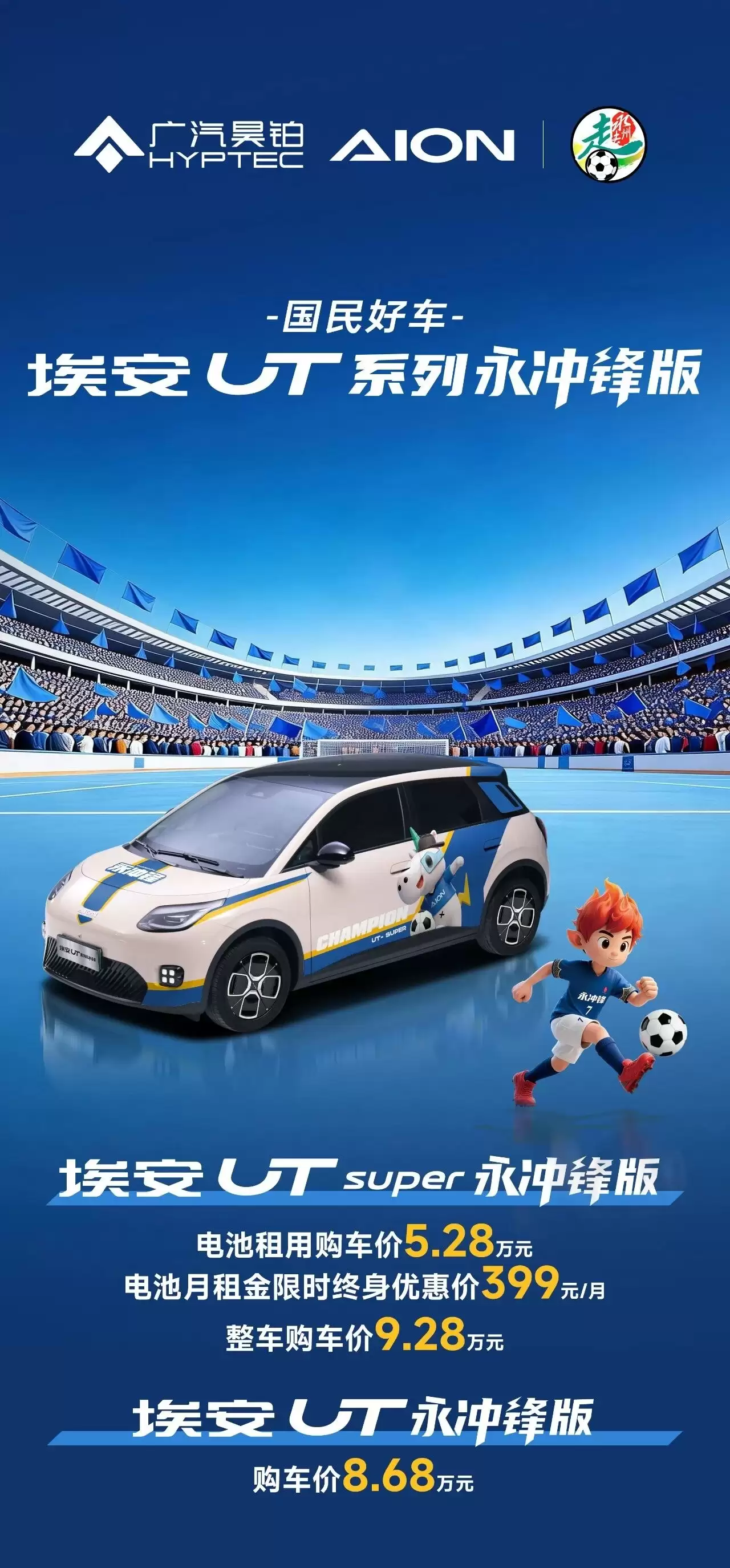 1月16日,广汽集团正式发布旗下埃安UT永冲锋版系列车型。其中,“永冲锋版”官方售价为8.68万元;“Super永冲锋版”售价9.28万元,该版本若采用电池租赁方式购车,车身价格为5.28万元,电池月租金限时终身优惠价仅需每月399元。