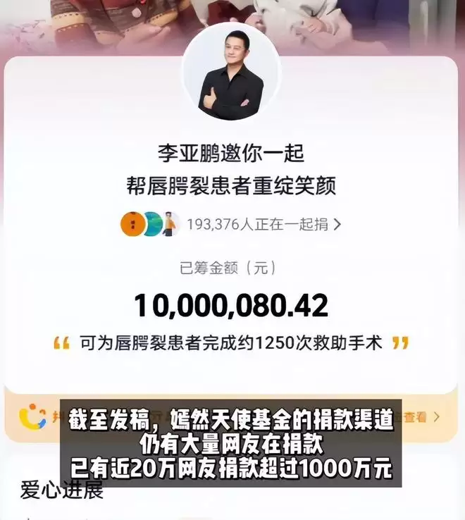 目前,网友们为了解除掉李亚鹏的困境,自发为其嫣然天使儿童医院捐款超1000余万元。