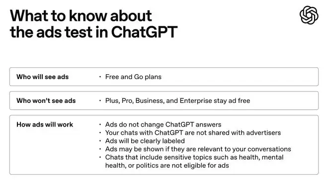 紧随其后的便是针对商业模式的试水。OpenAI 明确表示,计划在未来几周内开始在美区测试广告,主要覆盖免费版和 Go 版的已登录成年用户。这意味着,对于这部分用户而言,ChatGPT 不再仅仅是一个安静的对话框,而将成为一个具备商业分发能力的入口。