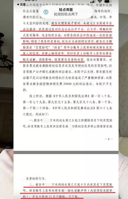 根据女子晒出的判决书内容,法院认为她在处理家庭矛盾时,未通过合法途径寻求救济,而是通过在公开平台发布带有侮辱、攻击性的言论,对丈夫的社会评价造成了负面影响,已构成对名誉权的侵害。判决要求她删除在相关平台发布的涉及丈夫及其家人的信息,并在上述账号发布赔礼道歉声明,内容需经法院审核,且至少保持15日不删除、不下架。