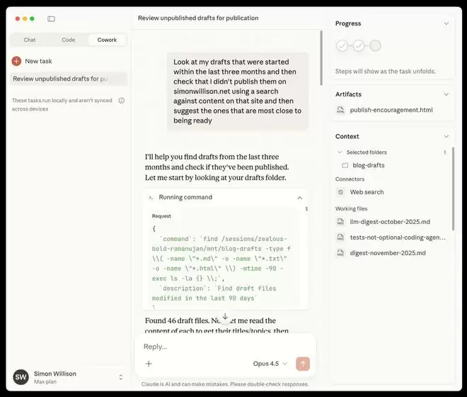 Simon Willison自己也做了个实验。他没让Claude写代码,让它检索自己博客三个月内的草稿,确认哪些还没发布过,然后推荐最接近完成的几篇。Claude执行了44次独立搜索,最后给出了排序建议。