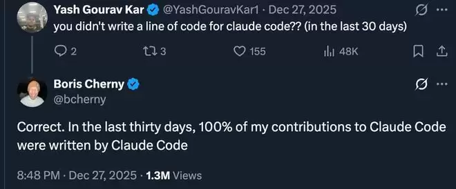 但最让人震惊的是Claude Code创造者Boris Cherny自己说的话。他在推特上公布了一个数据:30天内,他对Claude Code代码库的所有贡献,100%都是由Claude Code自己编写的。4万行新代码,259个PR,全部出自AI之手。