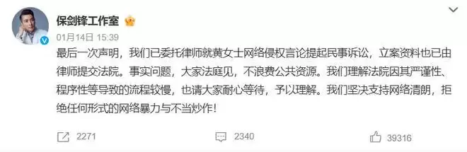 保剑锋工作室称这是最后一次声明,已经委托了律师就黄女士的网络侵犯言论提起了诉讼,整个过程会比较慢,也请大家耐心等待,拒绝任何形式的网络暴力和不同炒作。