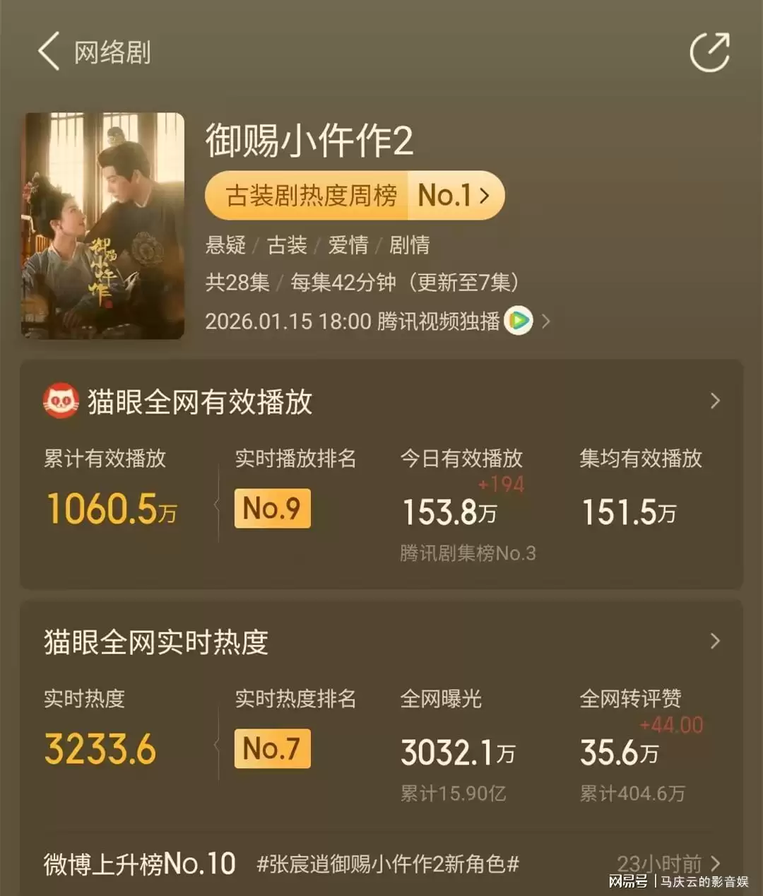 该剧上线3日,猫眼专业版的数据显示,它的有效播放数字才刚刚突破1060.5万,而集均播放数字则只有151.5万。须知,该剧首播的整体播放数字,高达13亿之多,属于典型的小成本电视剧播出了S级水平。而基于《御赐小仵作2》目前的有效播放数字而言,别说它实现首部的播放数字了,就算想达到首部播放数字的一半,估计都难以实现。
