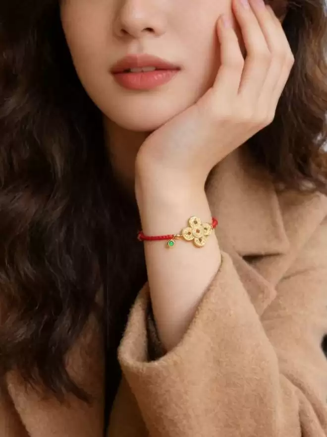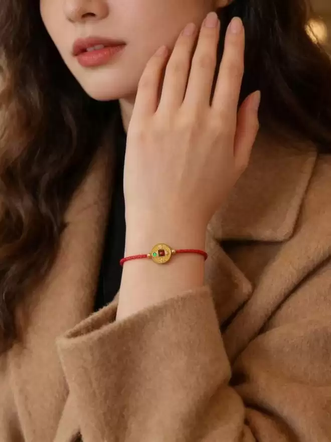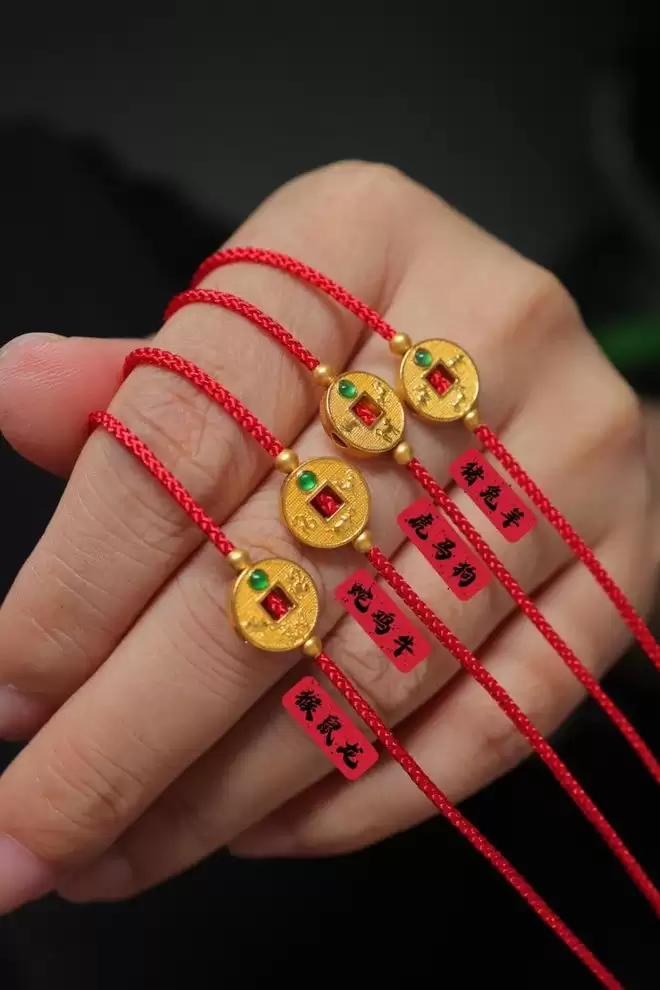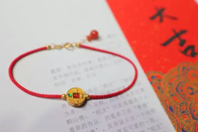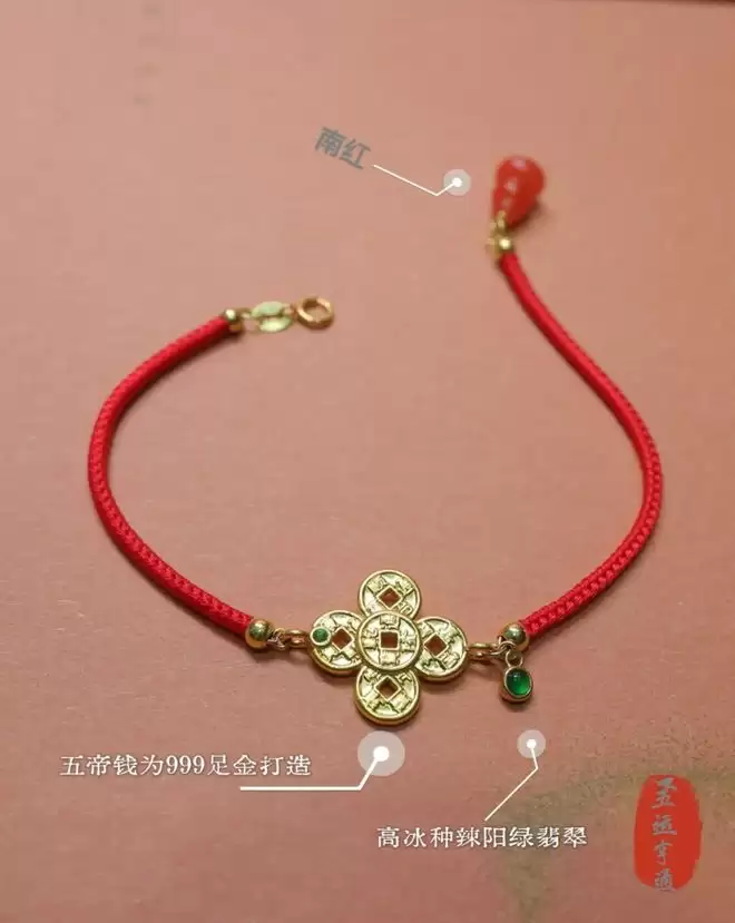 设计师很懂行,严格按照五行方位排列,在手链上微缩排出了一个聚气小阵法。而且用两颗高冰种辣阳绿翡翠(顶底各一颗)来压阵的,起到双重加持的作用。这条也是翠色极辣,刚好压住了铜钱的黄气(铜钱是足金的),瞬间变得贵气逼人。红绳尾巴还有一颗高品质南红圆葫芦,红上加红。