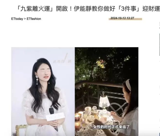 前几天深夜看伊能静直播卖货,点进去的时候她在大谈玄学。她应该真的很信这些,尤其九紫离火旺中女这个说法,我在各个场合看她反复提过很多次了。