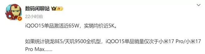 而且当博主的信息出炉之后,有很多网友直呼iQOO 15 Ultra值得进行等待了,原因也非常的简单,那就是标准版的销量已经很优秀。