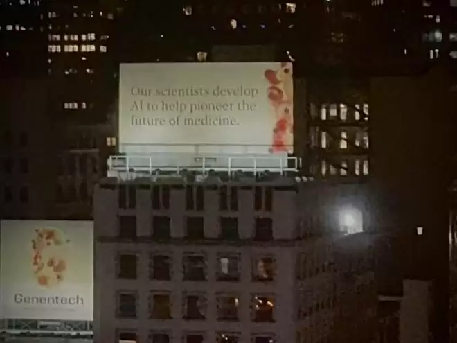 在今年的JPM大会上,已有不少AI小公司打出广告并寻求与大厂的合作。一些AI公司还在旧金山市中心的摩天大楼顶端立起广告牌,“我们的科学家正在开发AI以帮助驱动未来的药物发现”,某公司的一句广告语这样写道。