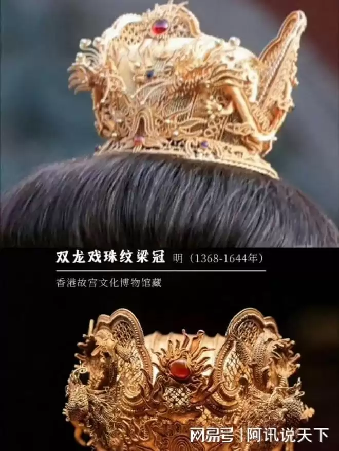 明黄龙袍象征帝王尊贵身份,采用“双龙戏珠纹梁冠”头饰。(实物在香港故宫文化博物馆收藏)梁冠以金丝编织龙首与火珠,饰有莲花、蝙蝠等吉祥纹样,行走时龙首通过弹簧微微摆动,凸显威严。