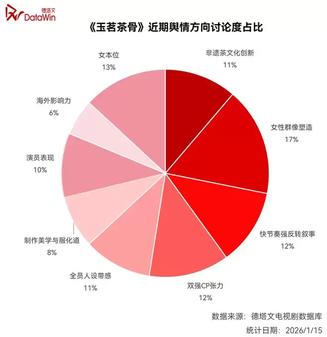 支撑这份亮眼成绩单的,是剧集“高能反转”与“极致人设”并行的双重策略。 德塔文数据显示,在舆情讨论中,“快节奏翻转叙事”、“女性群像塑造”、“全员人设带感”位居前列。