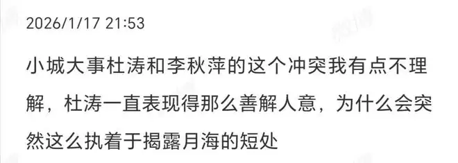 杜涛和李秋萍的这个冲突我有点不理解,杜涛一直表现得那么善解人意,为什么会突然这么执着于揭露月海的短处?