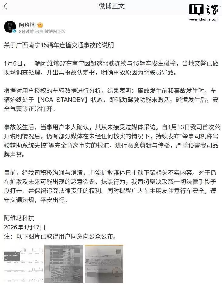 阿维塔回应南充15车连撞:辅助驾驶未启用,将打击恶意造谣