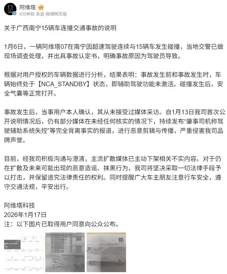 阿维塔就南宁15车连撞事故发声:超速与辅助驾驶未激活系主因