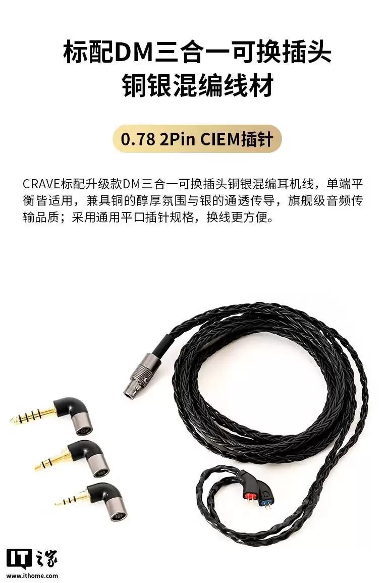在外观设计上,CRAVE同样倾注心血。它提供了清澈纯透明与深邃黑色透明两种壳体选择,以满足用户不同的审美偏好。标配的DM三合一可换插头铜银混编耳机线,不仅兼容单端与平衡接口,更确保了信号传输的稳定纯净。耳机还支持私模定制服务,用户可以根据个人喜好,自定义颜色、文字与图案,打造独一无二的专属耳机。