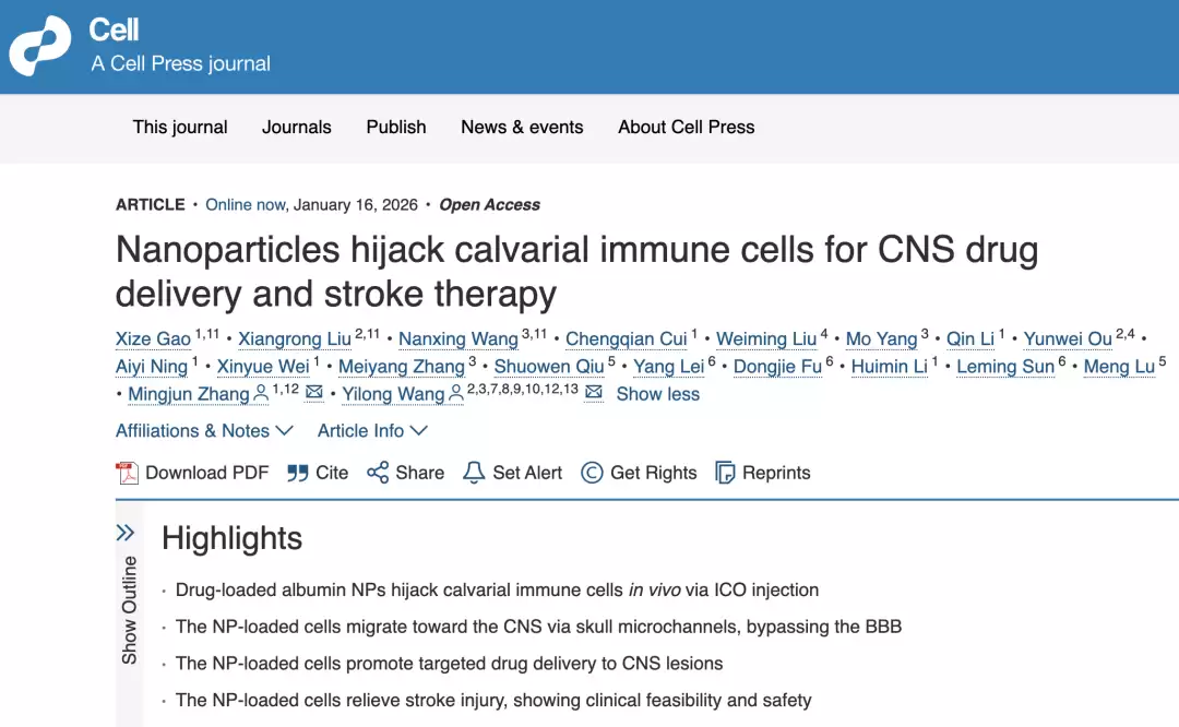 基于这一发现,研究团队采用颅骨骨髓微创注射方式,将白蛋白纳米颗粒直接送入颅骨骨髓腔内。实验结果显示,这些纳米颗粒可被颅骨骨髓免疫细胞高效摄取,形成“颅骨免疫细胞微纳机器人”。团队成员介绍说:“这并非传统意义上的‘机器人’,而是吞噬了纳米颗粒后的免疫细胞。纳米颗粒本身没有靶向效果,被细胞吞噬后,就会被带往前去需要的地方,执行精准的药物递送。该给药方式体内系统暴露极低,纳米颗粒几乎不进入外周血液和主要脏器,也不会影响免疫细胞活力,具备良好的生物安全性。”