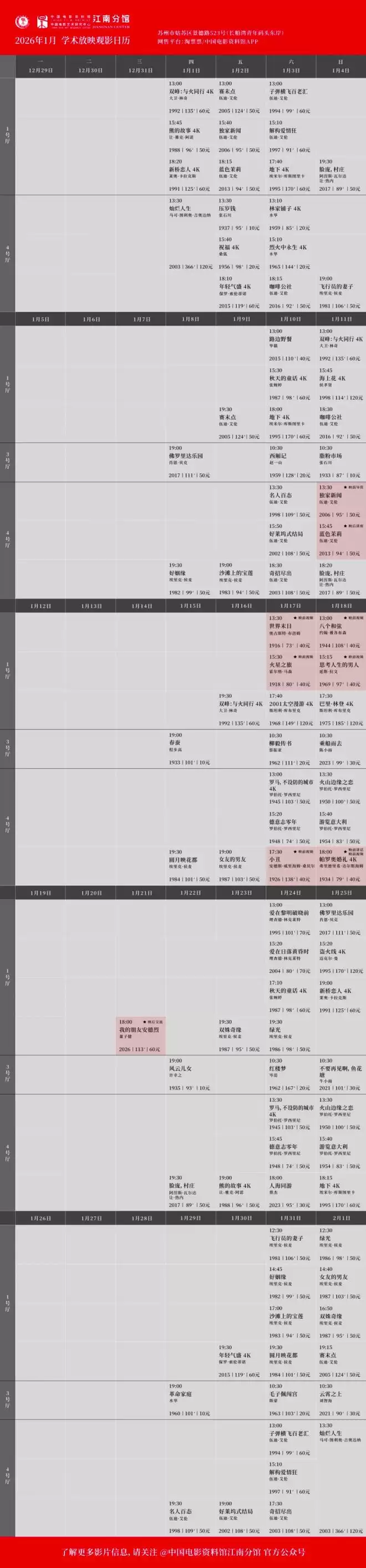 所有场次均可在淘票票、中国电影资料馆APP购票,具体排片见末图,祝大家观影愉快。❤️