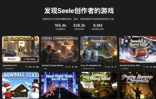 Seele 是一家专注于3D游戏的平台,致力于让用户可以一句话生成3D游戏。主打的是端到端的流程:输入一段文字,系统就能生成一个包含角色、场景/地图、玩法机制的可玩 3D 游戏雏形,并且支持持续 remix。正式也把它描述成 “Everyone’s 3D Playground”,强调的是“生成无穷 3D 游戏世界”和“无限重混”。