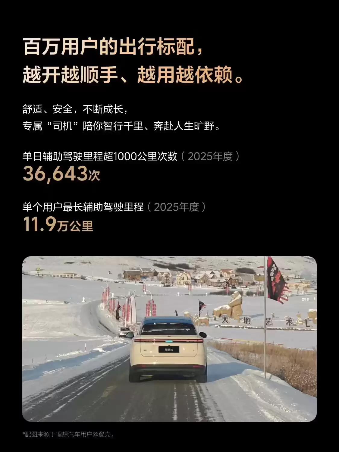 在2025年,理想汽车单日辅助驾驶里程超过1000公里的天数累计达到36643天,单个用户最长的连续辅助驾驶里程记录为11.9万公里。VLA语音指挥功能全年累计被调用1225.4万次,用户驾驶偏好累计记忆次数为20.1万次。