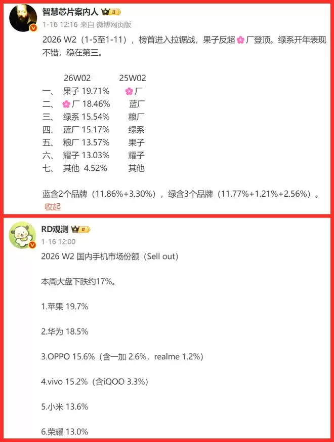 OPPO(绿系)和vivo(蓝系)本周表现极其稳健,分别以15.54%和15.17%的份额守住了第三、四名。