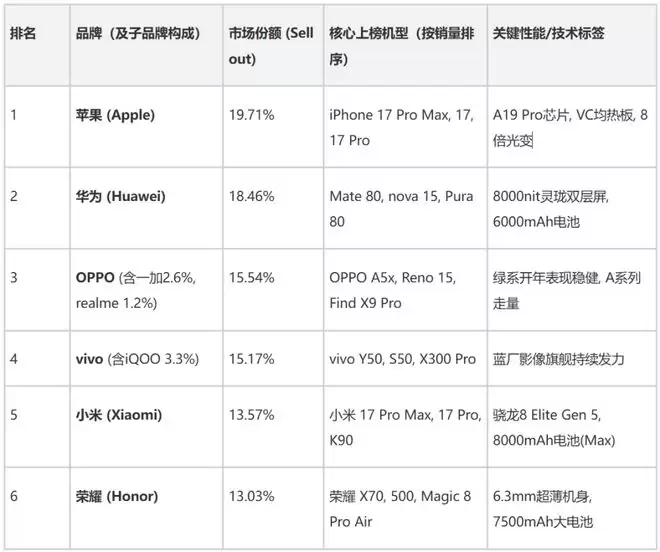 苹果(果子)在经历了一段时间的沉寂后,凭借iPhone 17系列的持续放量,成功反超华为(花厂),以微弱优势登顶。