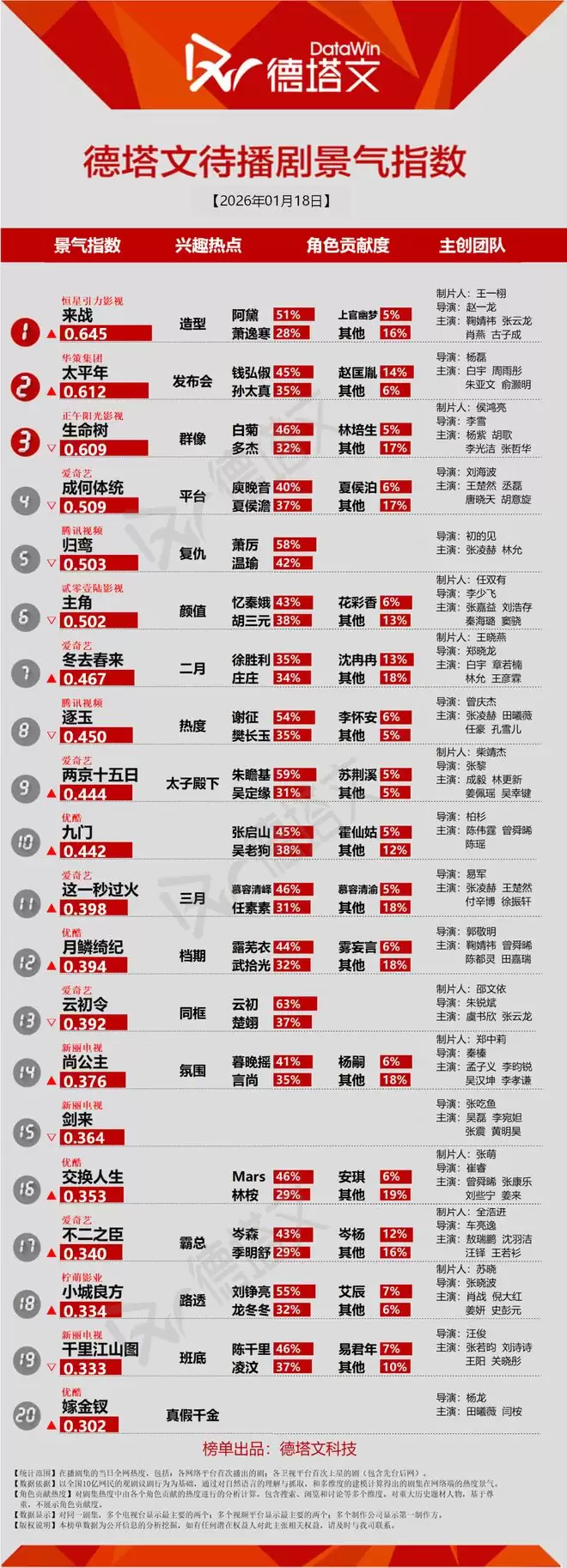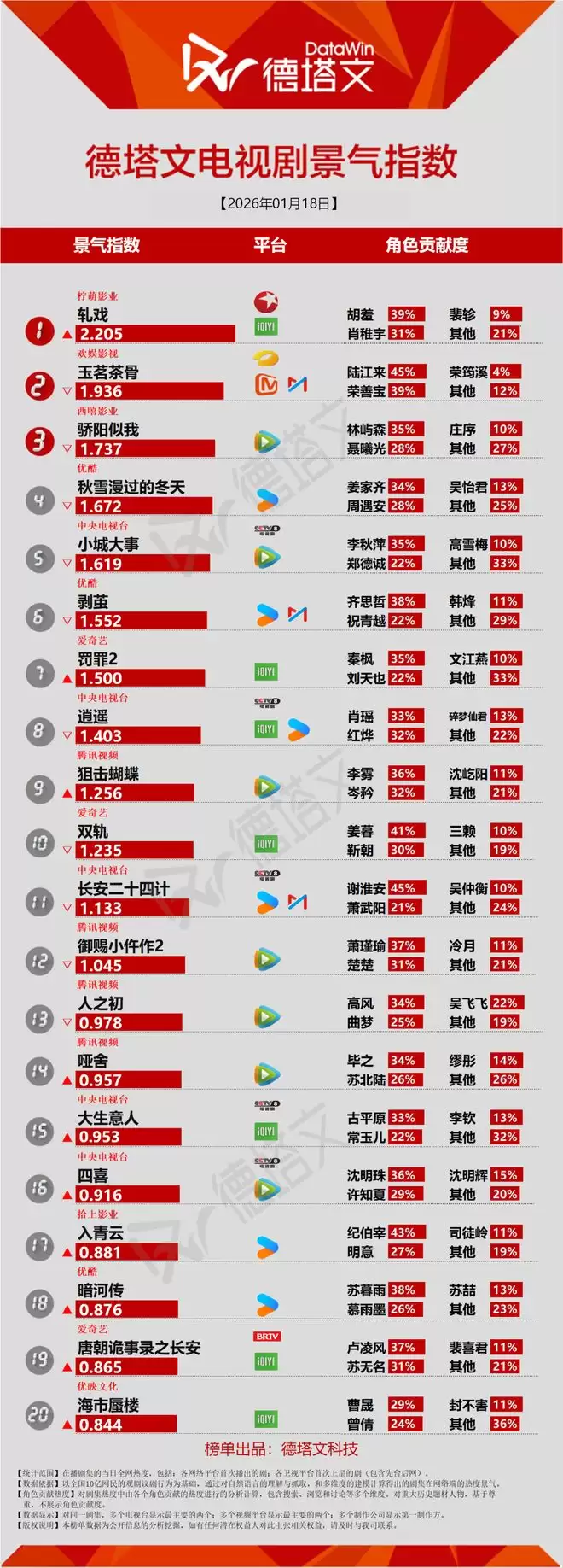 德塔文电视剧景气日报2026-01-18电视剧当日景气TOP20TOP20排名轧戏(胡羞39% 肖稚宇31%) 玉茗茶骨(陆江来45% 荣善宝39%) 骄阳似我(林屿森35% 聂曦光2