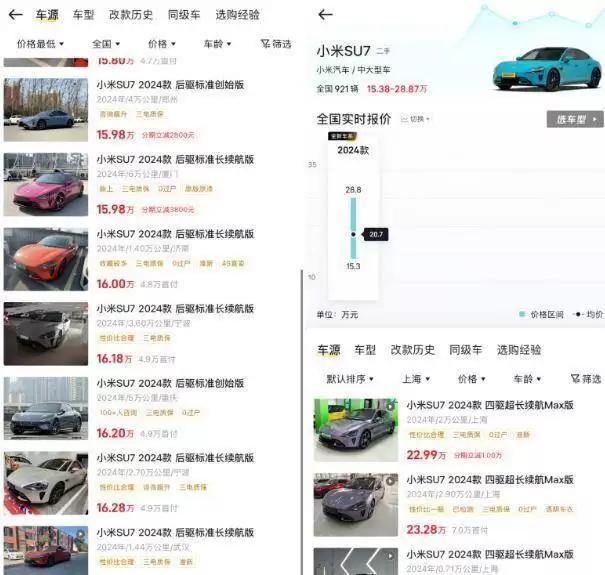 最近,小米SU7在二手车市场的价格变动引发了广泛讨论。这款上市不久的新能源车型,在二手市场上遭遇了价格“滑铁卢”,部分车源价格在半年内跌幅接近5万元,个别案例甚至超过15万元,让不少车商和车主直呼“措手不及”。