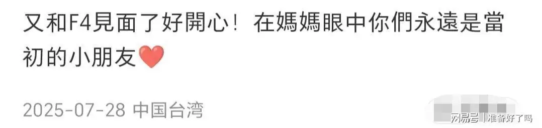 我们往前翻了翻记录,发现去年七月F4在五月天北京演唱会上惊喜合体时,她也去现场看了,并且当时也在社交账号上分享了那份喜悦。她说,在她的眼里,这四个“小朋友”永远都是最初认识时的那个样子。