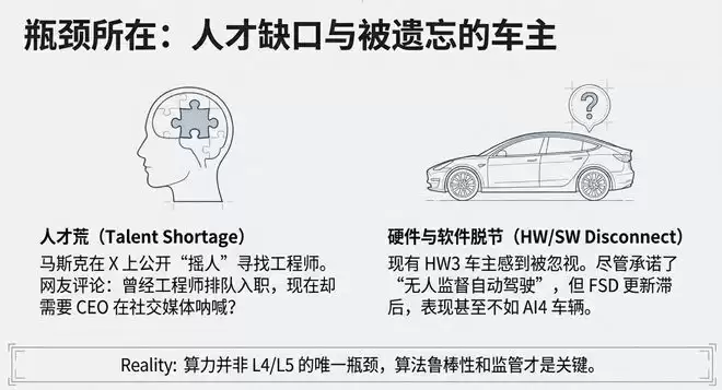 此外还有硬件与软件的脱节。汽车媒体electrek认为:“这种对下一代硬件的一味执着,让现有车主颇感不快。我们已广泛报道过Hardware3(HW3)车主如何感到被忽视……尽管当初向他们销售时承诺的是‘无人监督自动驾驶’,但其FSD更新却滞后,或表现反而不如搭载AI4的车辆。马斯克此前曾声称,实现‘全自动驾驶’仅需HW3足矣,然而我们现在却已在谈论AI6、7和8了。”