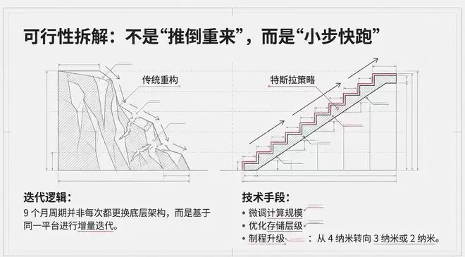 9个月的周期意味着特斯拉不会每推出一代都更换底层架构,而是基于同一平台进行增量迭代。通过微调计算规模、优化存储层级或更换更先进的制程(从4纳米转向3纳米或2纳米),来实现性能提升。