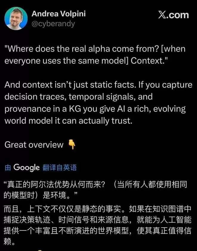 这篇文章在Twitter上获得了广泛转发,其中AI领域的资深从业者Andrea Volpini评论道:"语境不仅仅是静态的事实。如果你捕捉决策痕迹、时间信号,并在知识图谱中保存来源,你就能给AI一个丰富的、不断演化的世界模型。"