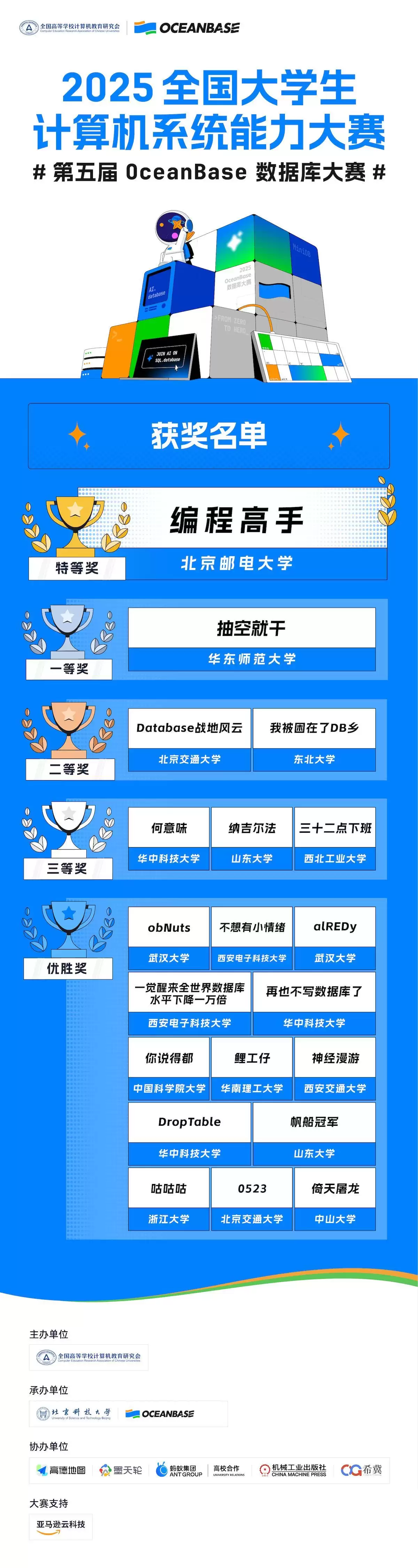 1月18日,2025年全国大学生计算机系统能力大赛暨第五届OceanBase数据库大赛在北京科技大学落下帷幕。本届赛事吸引了来自全国高校的1223支队伍、2620名学生参赛。经过两个多月的比拼,北邮“编程高手”队凭借在数据库内核优化与AI应用开发中的综合表现,夺得冠军及10万元奖金。