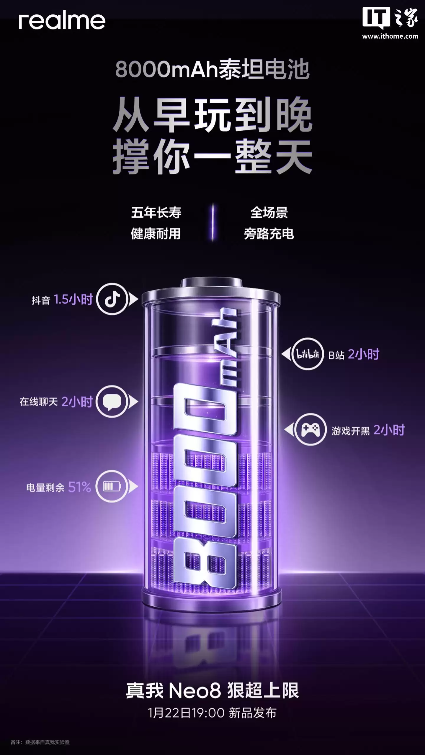 据介绍,真我Neo8配备的这块8000mAh泰坦电池不仅容量惊人,更被定义为一款五年长寿命电池,同时它还将支持全场景的“边用边充”功能。