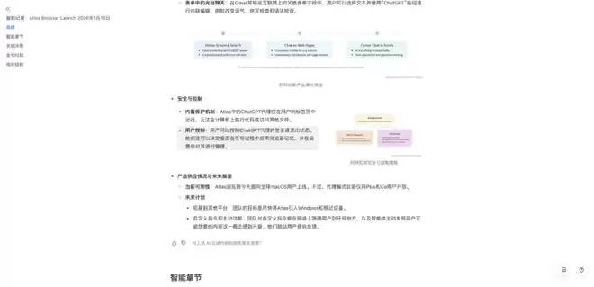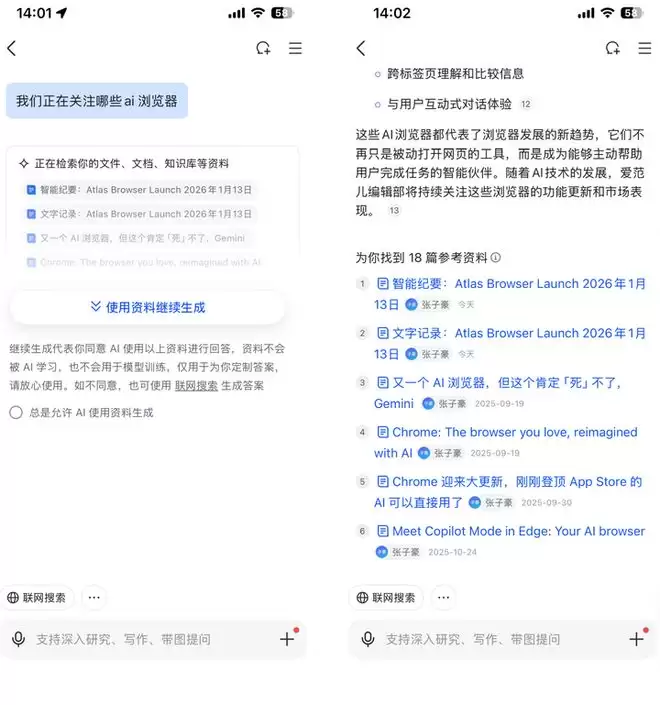 举个例子,当我们在 OpenAI 的发布会上,记录了关于 ChatGPT Atlas 浏览器的信息;然后我们在飞书的知识问答中提问,「我们在关注哪些 AI 浏览器」。它能从我全部的文档里面进行搜索,想到我之前写的 Google 浏览器、微软的 AI 浏览器等。