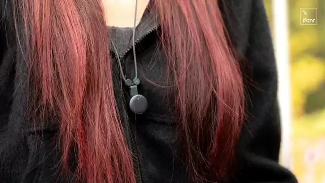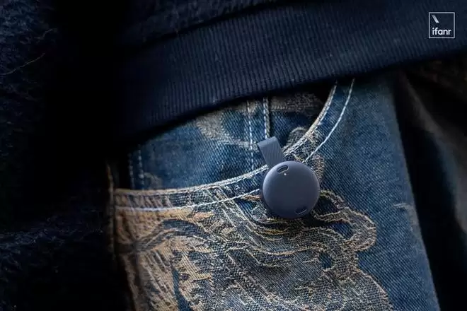 而这款产品最大的改变,是把设备做到了饰品级。它直径 23.2mm,重 10 克,大小和一枚硬币相仿。这带来的直接好处是,我们可以把它像胸针一样别在领口,或者像项链一样挂在胸前。